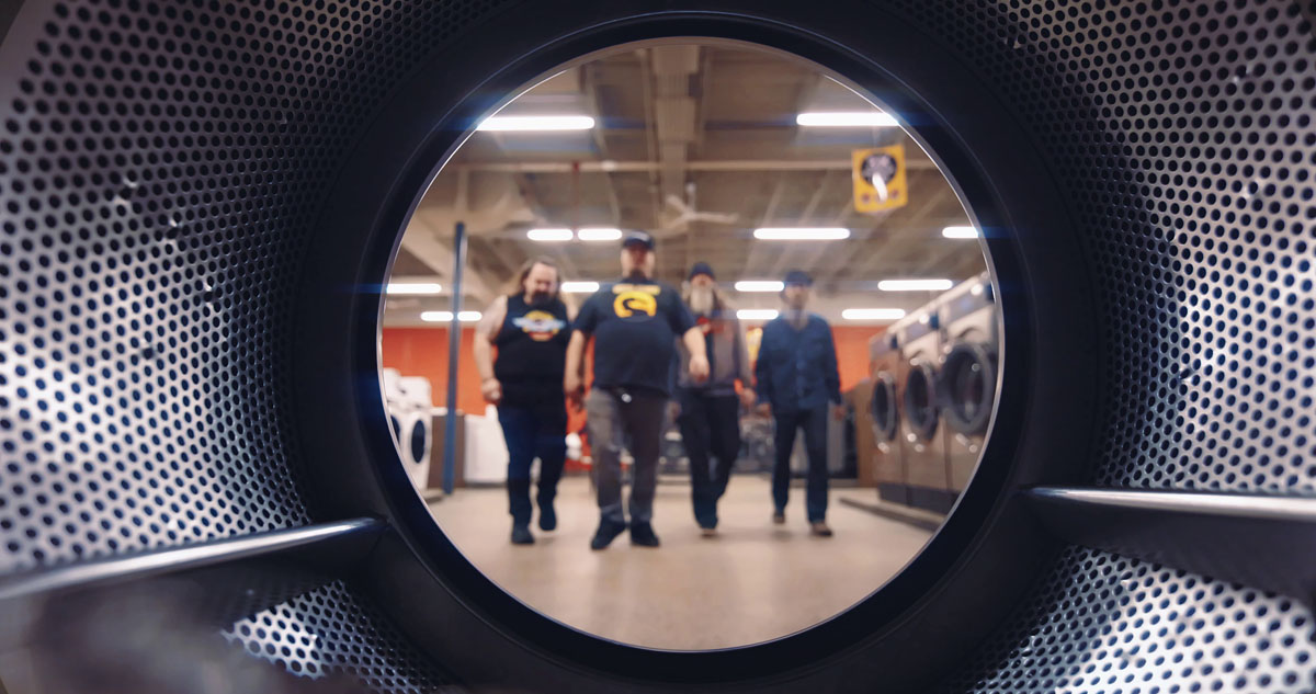 An actual live laundromat with active patrons bustling about doing their laundry. Miscellaneous antics and imagery taking place all in one shoot location.